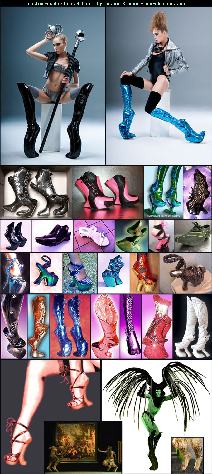 There's been a fair amount of fuss made along the way about the outrageousness and originality of the platforms shown in Olivier Theyskens' final collection for Nina Ricci for Fall 2009, and in Alexander McQueen's Spring 2010 collection. Meanwhile, a fellow named Jochen Kronier has been quietly designing and custom-making fabulously outrageous and original platform shoes and boots in his various studios since 1994. The following is my small way of telling a bit more of the world about Herr Kronier's amazing designs... (And premiering a new series at MildredLovesYou.com while doing so...)